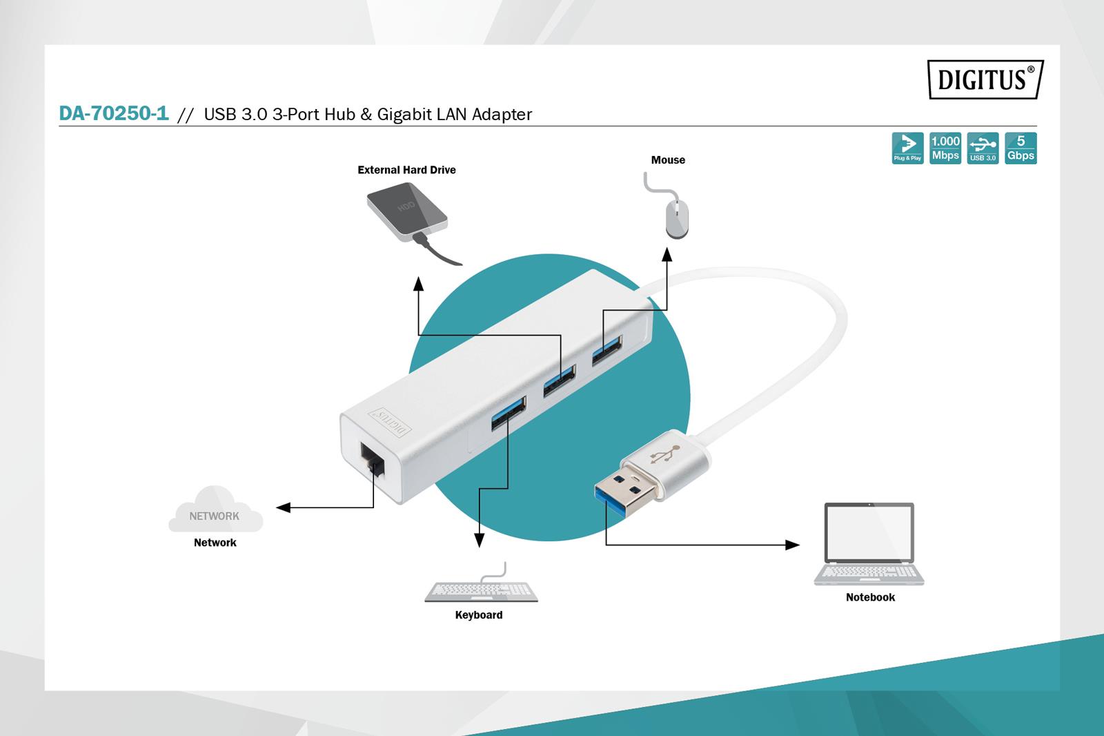 | Opis ogólny | HUB/Koncentrator 3-portowy USB 3.0 SuperSpeed z Gigabit LAN adapter |