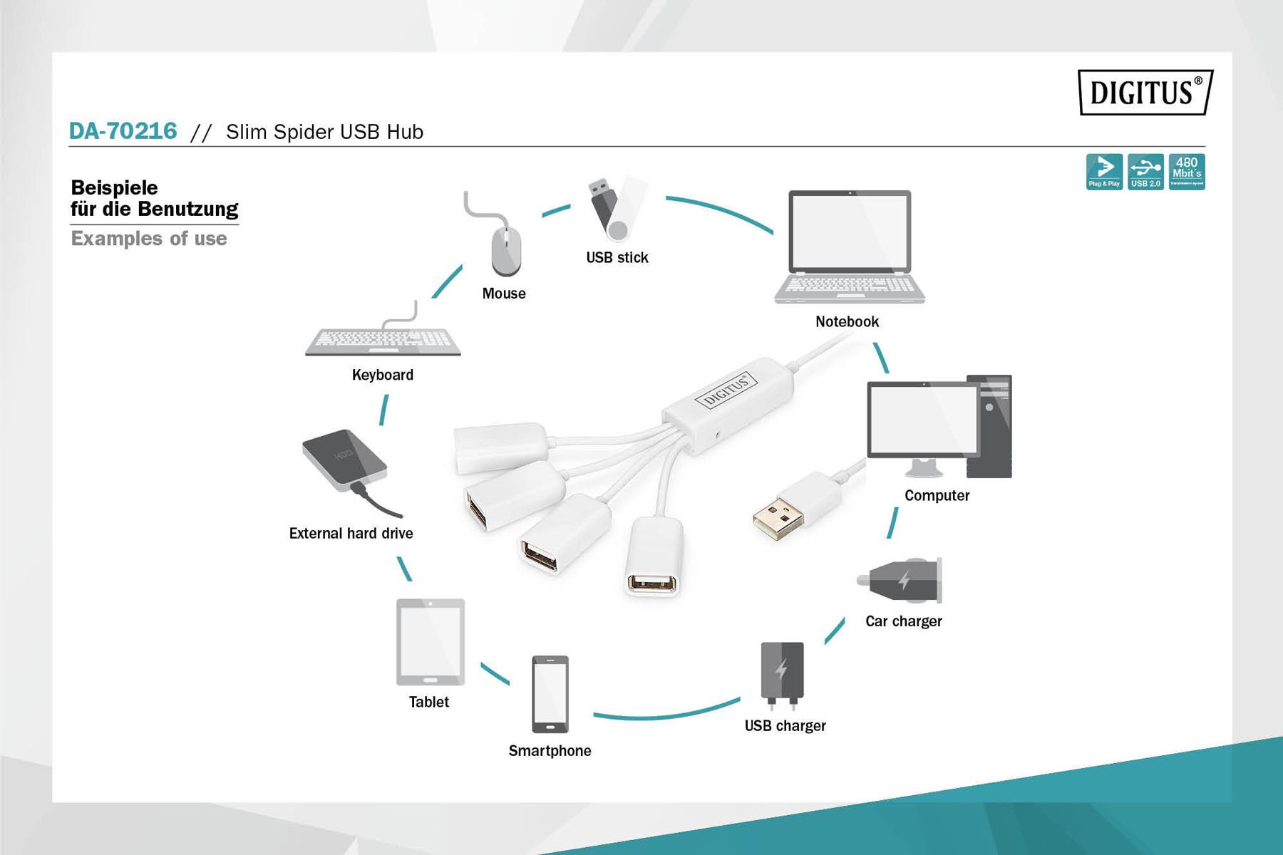 | Opis ogólny | HUB/Koncentrator 4-portowy DIGITUS "Spider" USB 2.0 SuperSpeed, pasywny |
