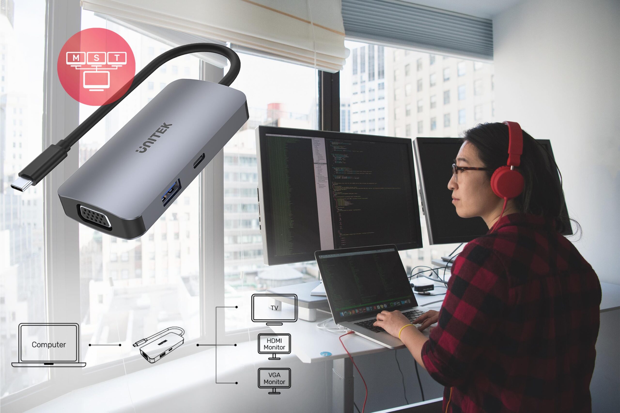 | Opis ogólny | Hub USB-C Unitek D1051A 1x USB 3.1, VGA, 2x HDMI, PD |