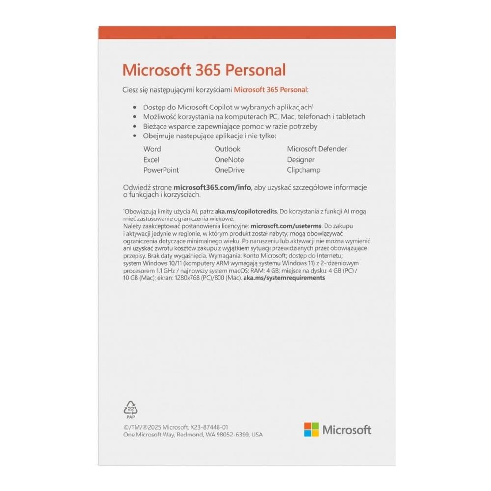 | Opis ogólny | Oprogramowanie Microsoft M365 Personal PL 1Y 1U 5D Win/Mac EP2-32454 |