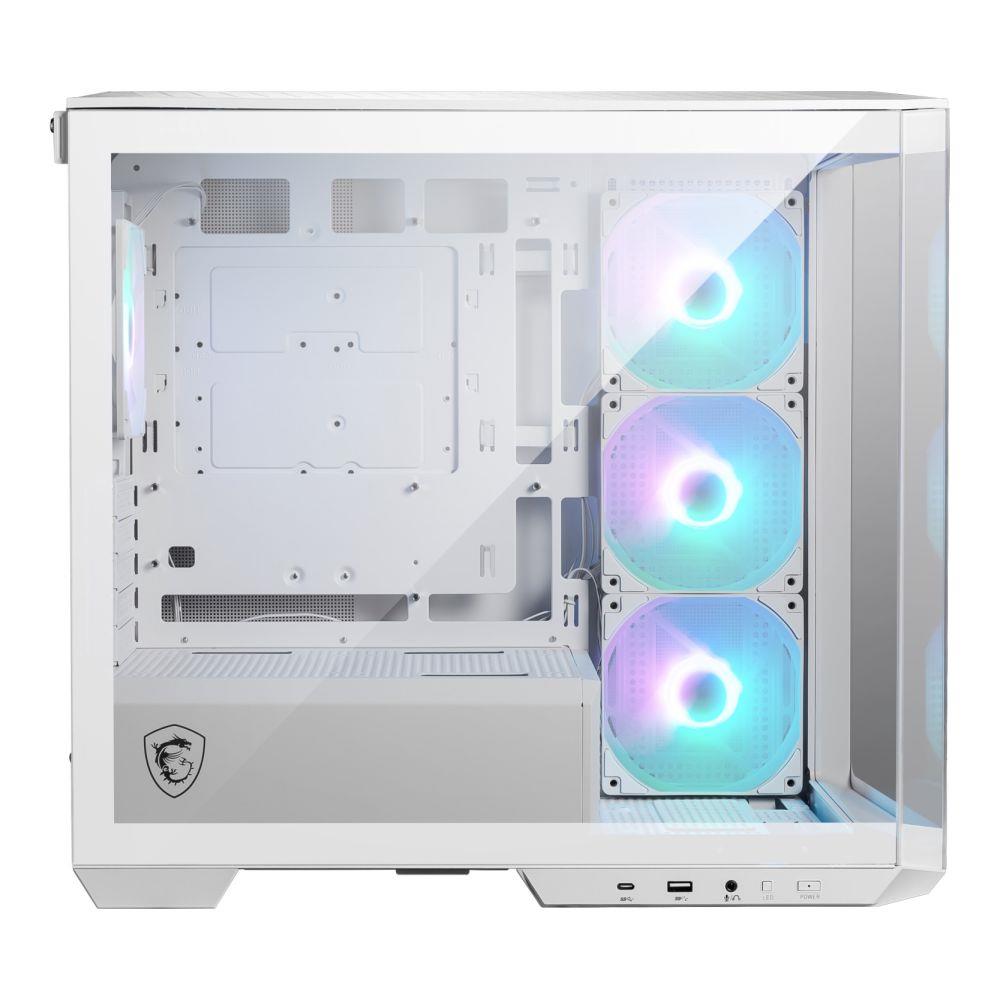 Wstępna wersja z wentylatorem z odwróconymi łopatkamiZ boku zamontowane są fabrycznie wentylatory z odwróconymi łopatkami, umożliwiające niezakłócone wyświetlanie piękna wentylatora ARGB bez jakiejkolwiek ingerencji ze strony ram wentylatorów.Panoramiczny wyświetlacz 270 stopniCzerpiąc inspirację z logo MAG, stwórz charakterystyczny projekt podwozia, który ucieleśnia unikalne cechy MAG. Przednie wnętrze obudowy zawiera przestrzeń do ekspozycji figurek, uzupełnioną panoramicznym, hartowanym szkłem o kącie 270 stopni, przekształcającym ją w obudowę w stylu wizytówki.Stojak podtrzymujący procesor graficznyWyposażona we wskaźnik poziomu, który zapewnia łatwą regulację wysokości podpory podczas montażu, zapobiegając jej osiadaniu. Tymczasem jego podstawa magnetyczna zapewnia większą stabilność obudowy.1 do 4 Płyta sterująca ARGB-FANTa płyta sterowania wentylatorem obsługuje do 4 funkcji wentylatorów ARGB. Umożliwiają użycie przycisku przełącznika LED do intuicyjnej regulacji oświetlenia ARGB.