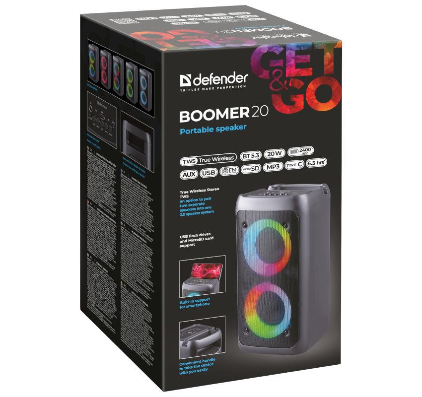 | Opis ogólny | Głośnik Defender BOOMER 20 Bluetooth 20W MP3/FM/SD/USB/AUX/TWS/LED/MIC |