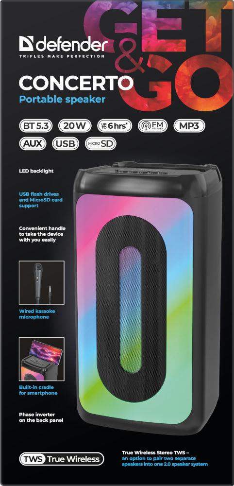 | Opis ogólny | Głośnik Defender CONCERTO Bluetooth 20W MP3/FM/SD/USB/AUX/TWS/LED/MIC |