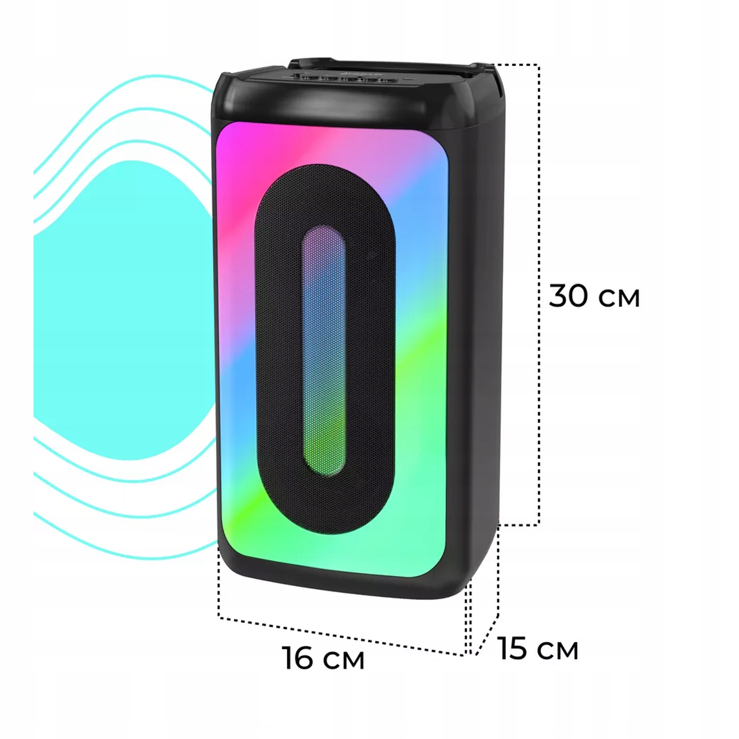 Na górze kolumny znajdziemy wygodną rączkę która zapewnia komfort podczas transportu kolumny w dowolne miejsce oraz miejsce na telefon/tabler