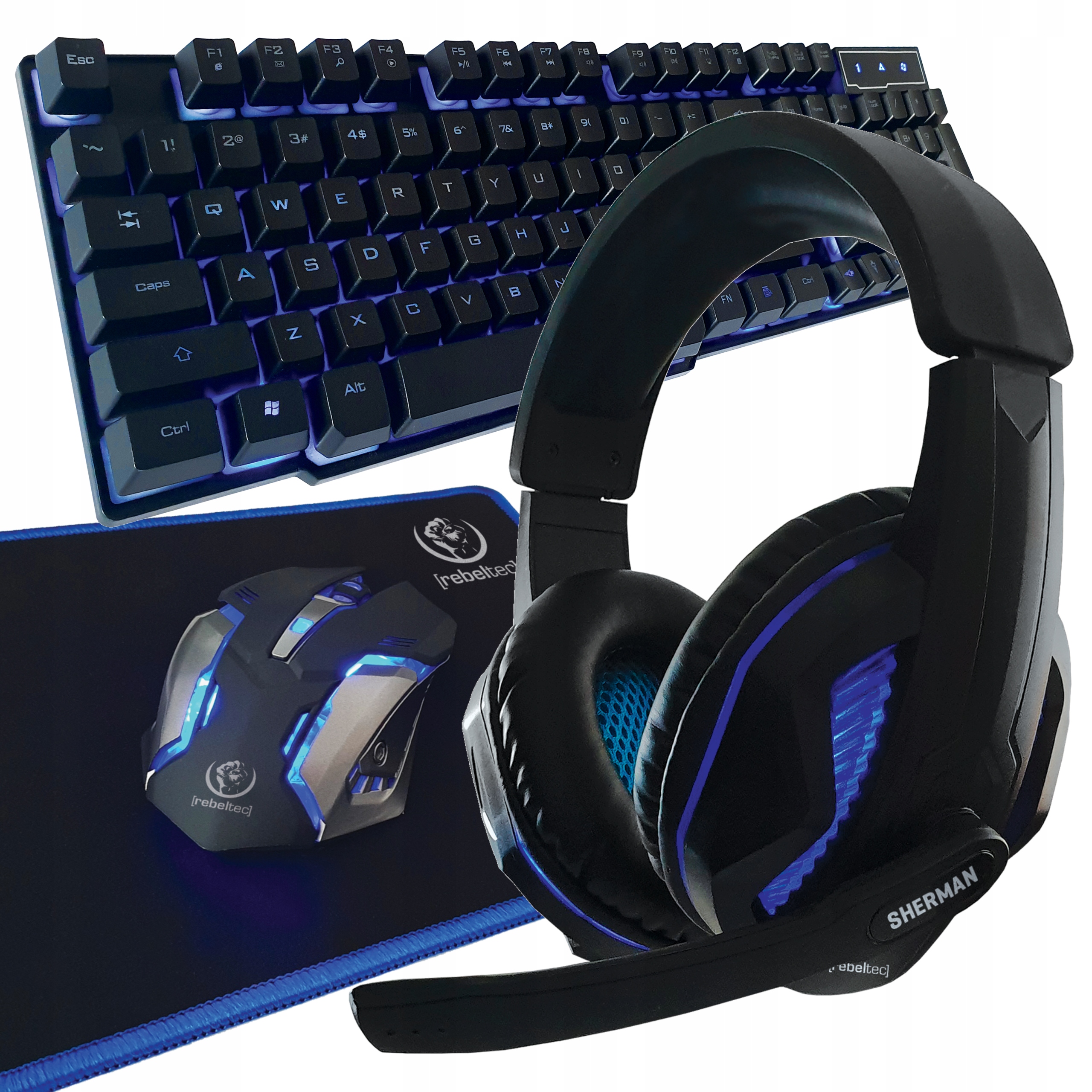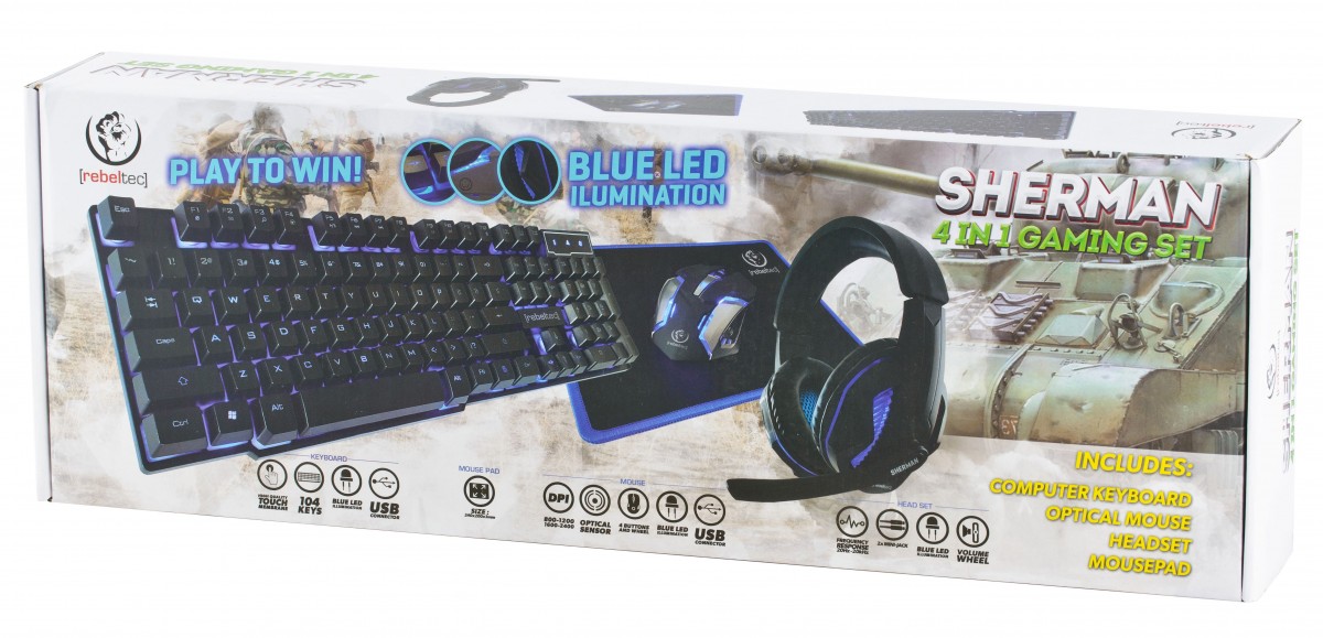 | Opis ogólny | Zestaw przewodowy klawiatura+mysz pad+słuchawki Rebeltec SHERMAN Gaming |