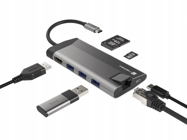 Natec Fowler Plus to niewielki multiport, który rozwiąże Twoje problemy i pozwoli Ci podłączyć co tylko zechcesz. Wyposażono go w aż 8 portów, pośród których znajdziesz 3 gniazda USB 3.0 typu A, port HDMI 1.4 wspierający rozdzielczość 4K, dwa czytniki kart (SD i microSD) a nawet gniazdo RJ-45 (1 Gb/s) i USB-C obsługujące standard ładowania Power Delivery 3.0. Korzystanie z akcesoriów jeszcze nigdy nie było tak wygodne.