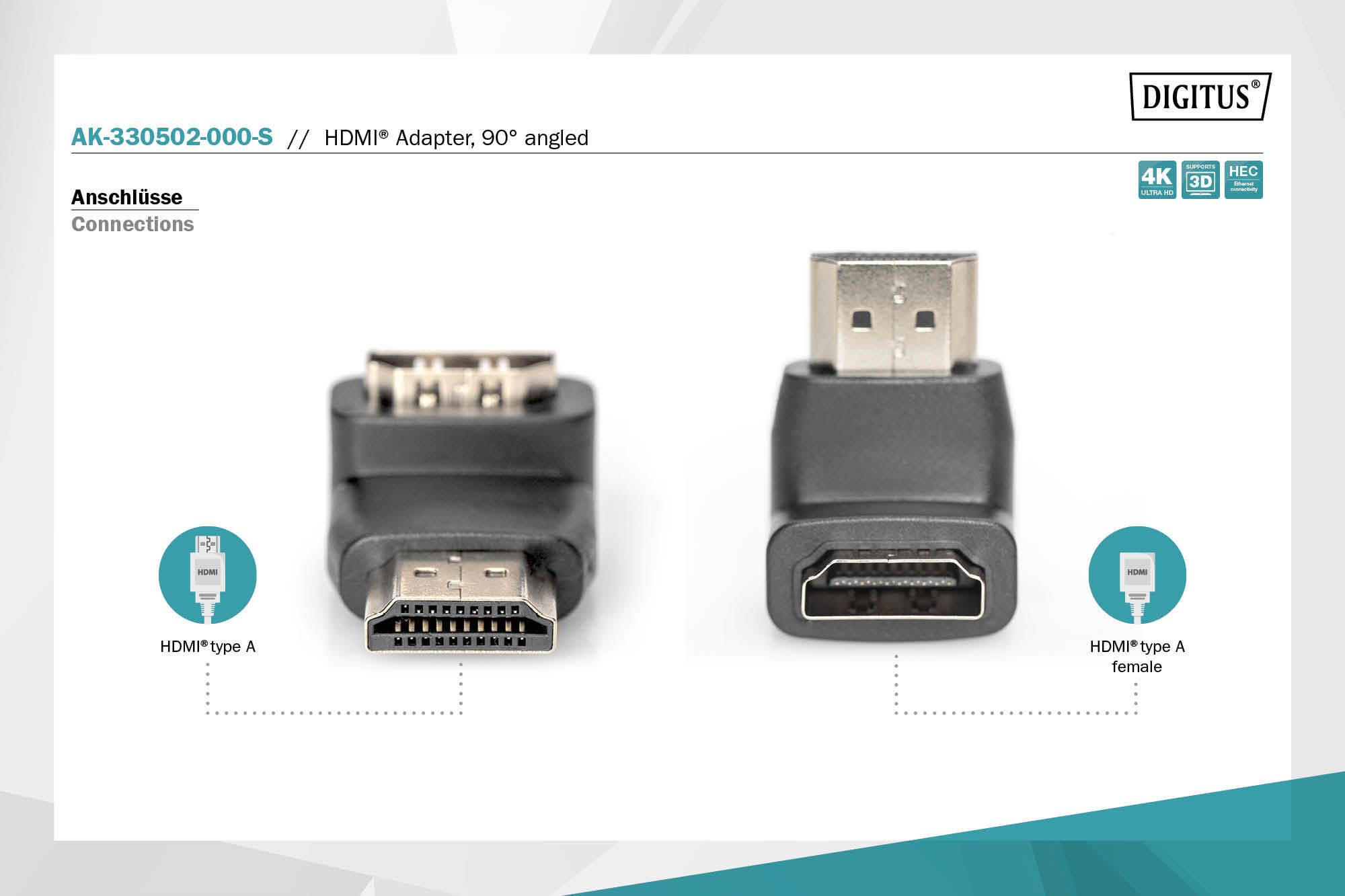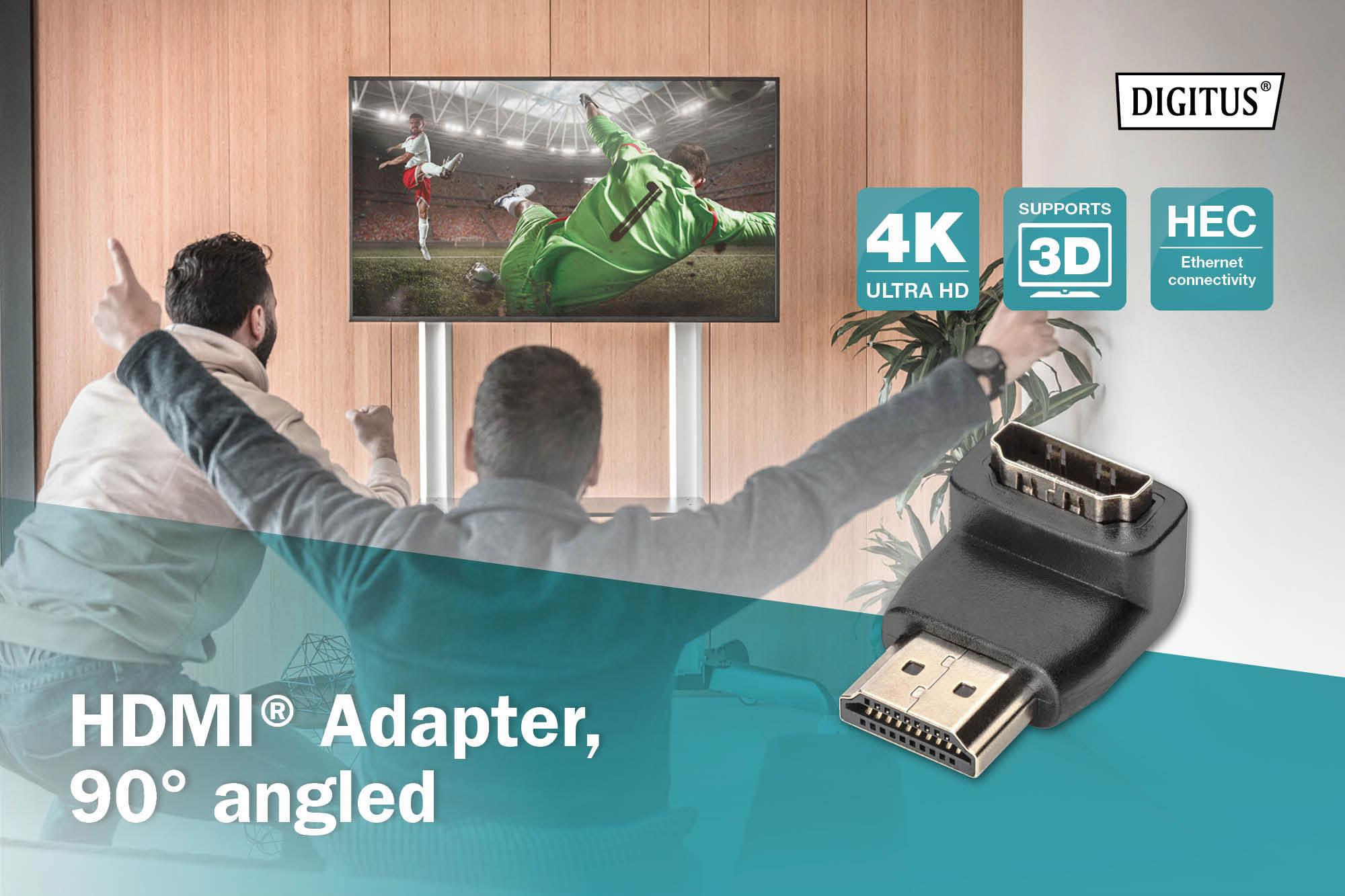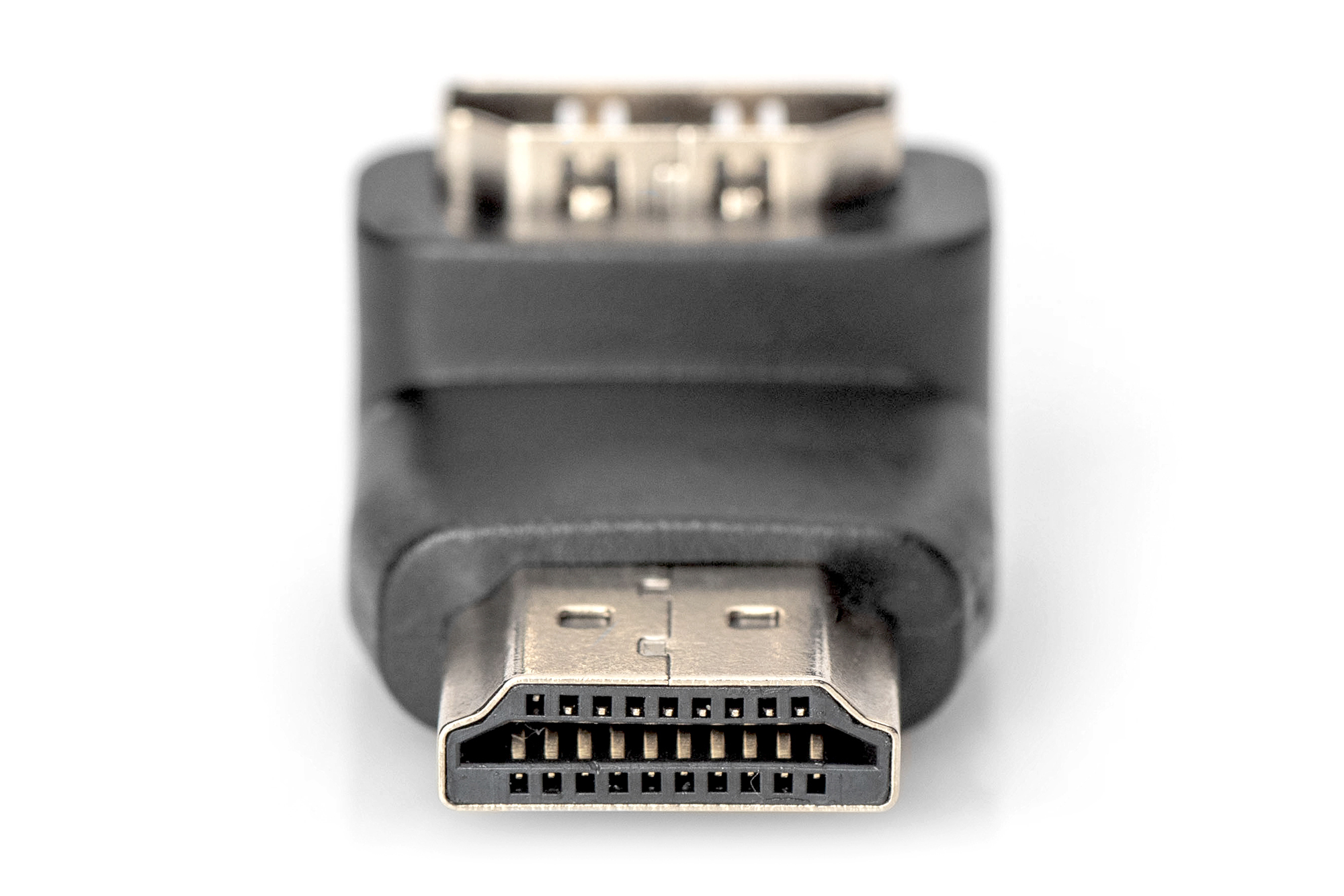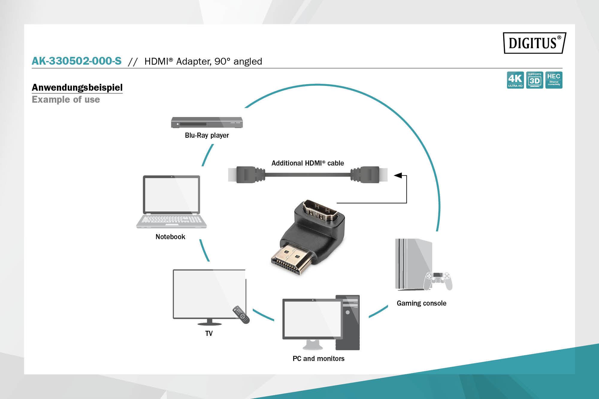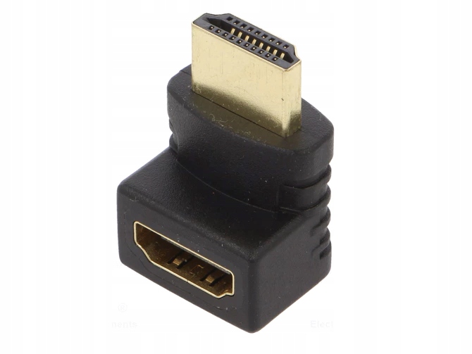 Ten adapter, odpowiedni dla w pełni HD (1080p) i 3D, jest stosowany do zapewnienia lepszego połączenia normalnych kabli HDMI z prostymi złączami, w przypadku braku miejsca. Aby np. uniknąć nadmiernego zaginania kabla.