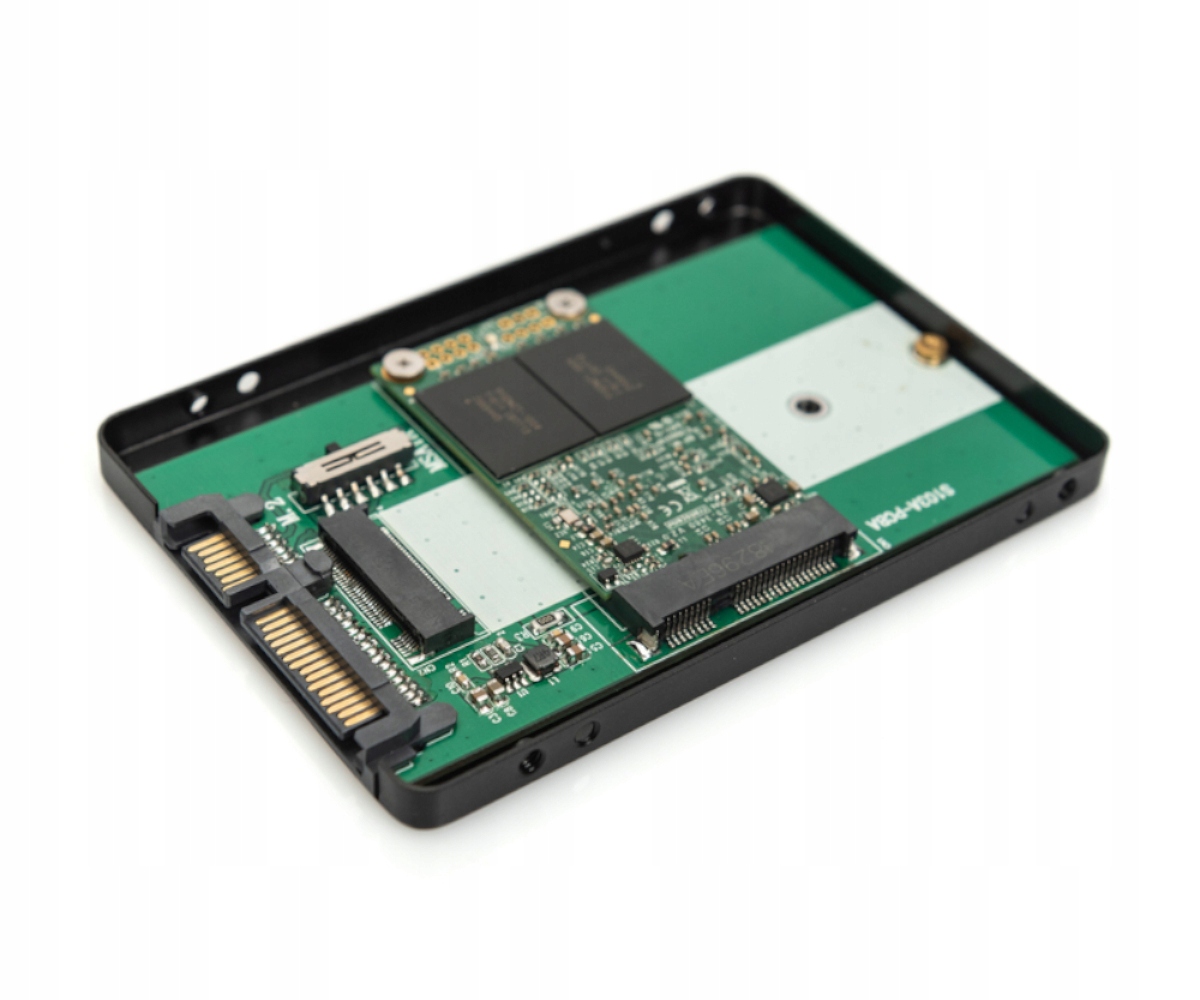 Adapter DIGITUS do dysku twardego SATA M.2 lub mSATA; Dzięki adapterowi możesz zwiększyć prędkość i wydajność systemu w komputerze PC lub notebooku. Ze względu na niewielką wysokość, może być instalowany we wszystkich popularnych notebookach. • 2,5 Adapter do dysków twardych o wysokości montażu 7 mm; • Odpowiedni do M.2 SSD (2230, 2242, 2260, 2280) z kluczem B-Key lub B+M-Key; • Odpowiedni do dysków SSD mSATA (full size); • Umożliwia uruchamianie systemu z wbudowanego dysku SSD; • Interfejs SATA III 6 Gbit/s; • Prędkość odczytu do 520 MB/s; • SATA Rev.3.2 z trybem oszczędzania energii DEVSLP; • Ustawianie trybu przełącznikiem DIP; • Zamknięta obudowa aluminiowa;