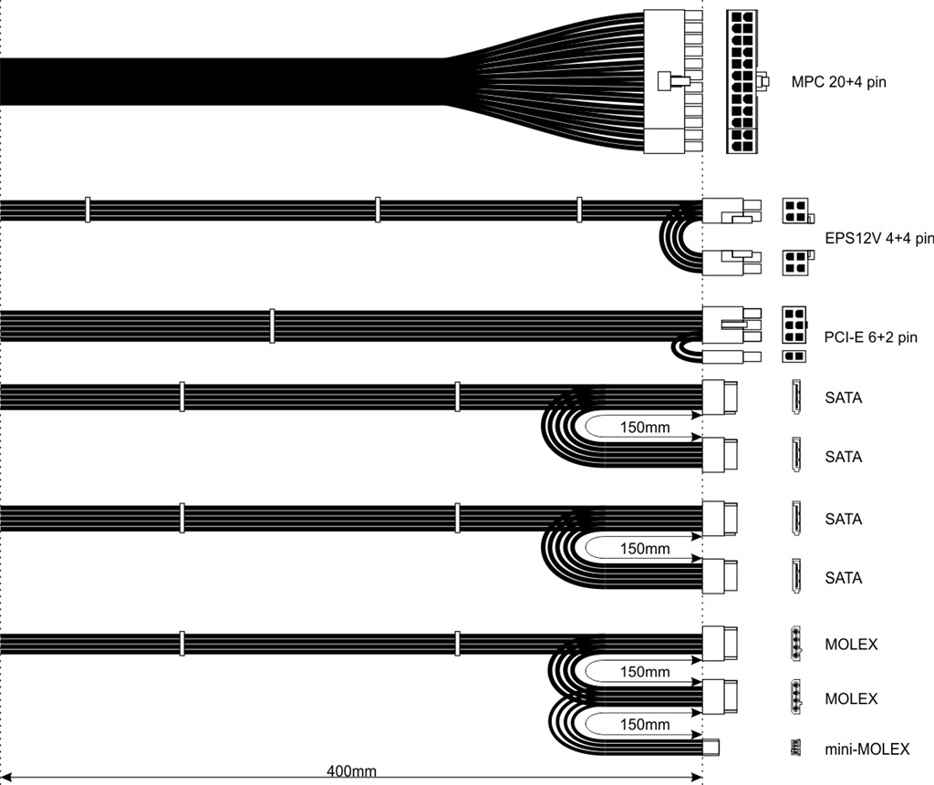 | Wtyczka zasilania | SATA x 4; EPS12V 8 pin (4+4 pin) x 1; Molex 4-pin x 2; ATX 20+4pin; PCI-E 6+2 pin x 1; mini-Molex x 1 |