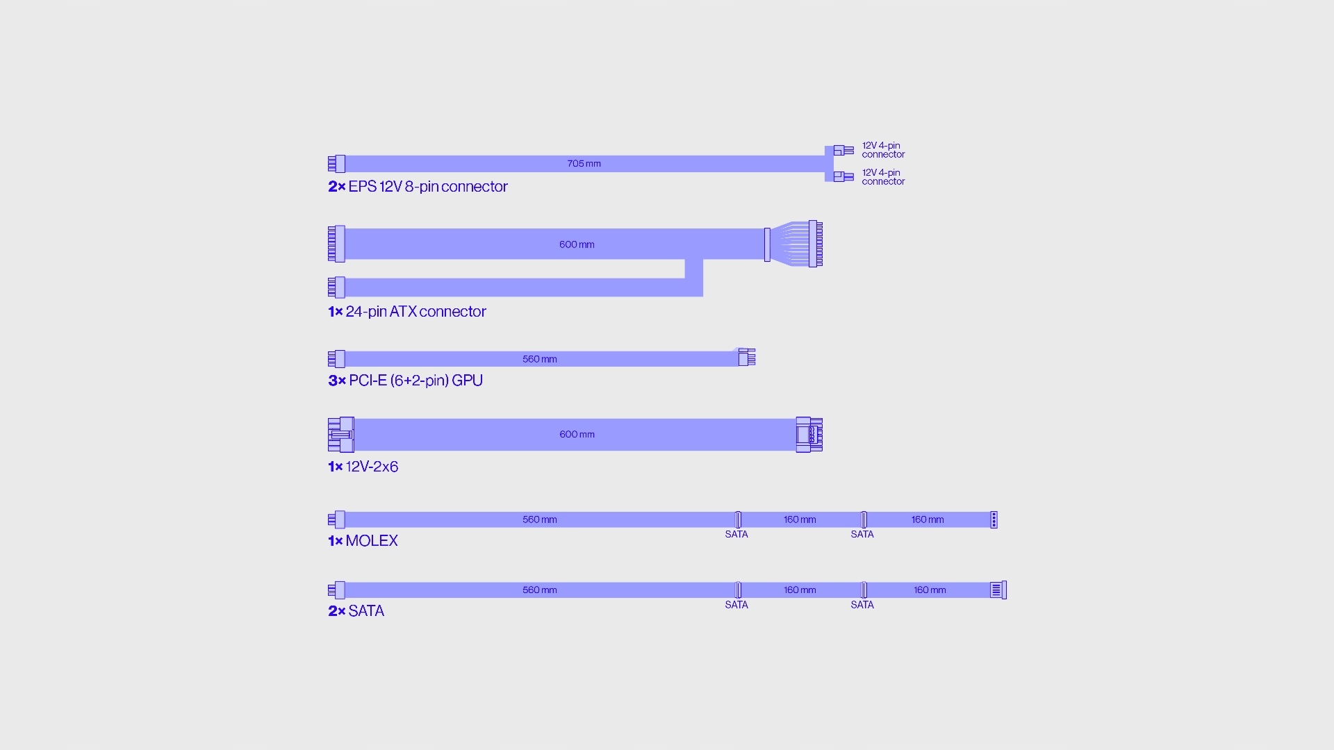 | Długość kabli | 1x 12V-2×6, 16 PIN, 600 mm; 2x EPS 12V 8-PIN (4+4), 705 mm; 1x ATX 24-PIN, 600 mm; 3x PCI-E 8-PIN (6+2), 560 mm; 8x SATA, 560 – 880 mm; 1x MOLEX, 880 mm |