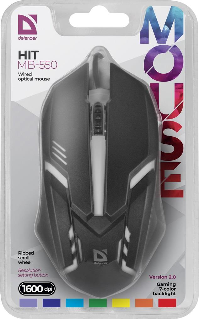 | Opis ogólny | Mysz przewodowa Defender HIT MB-550 1600dpi 3P czarna 7 kolorów |