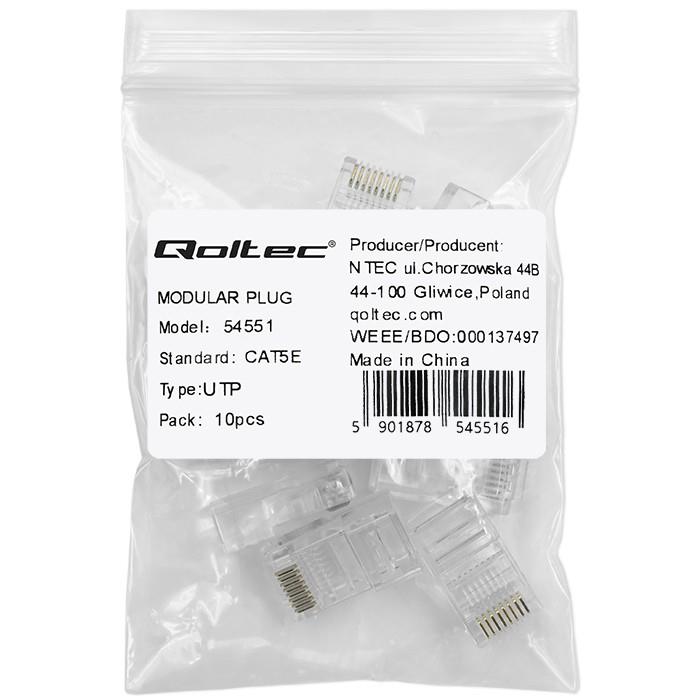 Wysokiej jakości zestaw metalowych złączy RJ45 o modularnej konstrukcji, kompatybilnych z kablami patchcord UTP Cat5e. Złącze posiada metalowe styki pokryte pozłacaną warstwą w celu zapewnienia lepszej przewodności i ochrony przed korozją. Nie posiadają dodatkowego ekranu ochronnego. Przeznaczone do zastosowań w miejscach o intensywnym natężeniu zakłóceń.